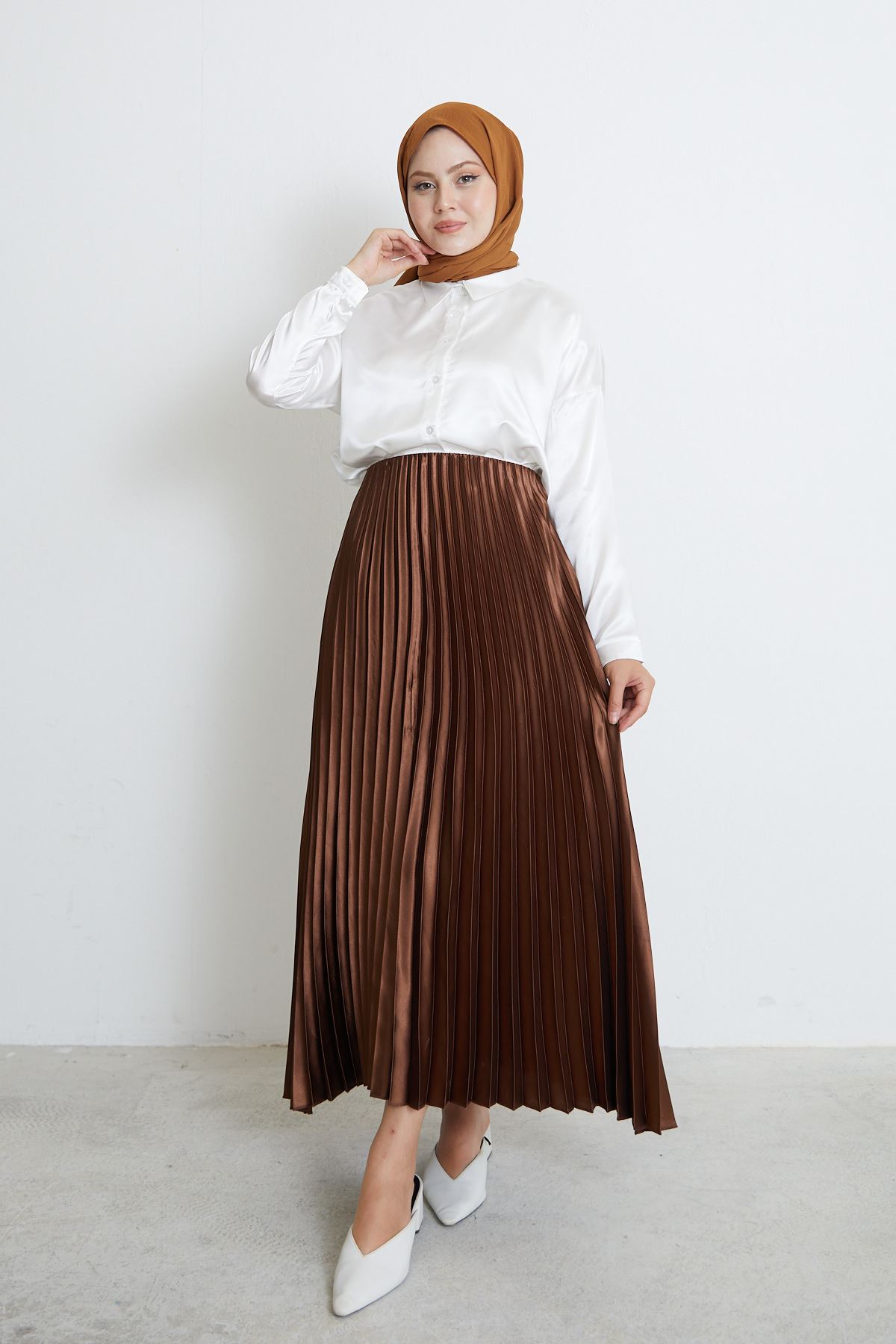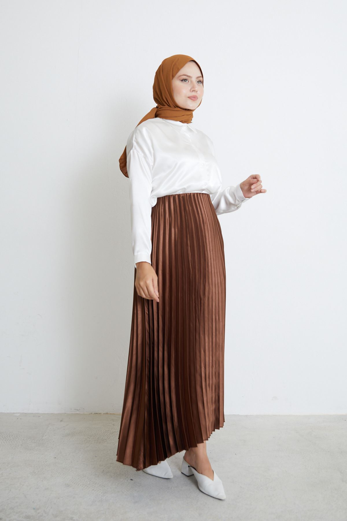 Saten Piliseli eteklerimiz ışığınızı yansıtacak pileleri bozulmaz ütü istemez özelliktedir