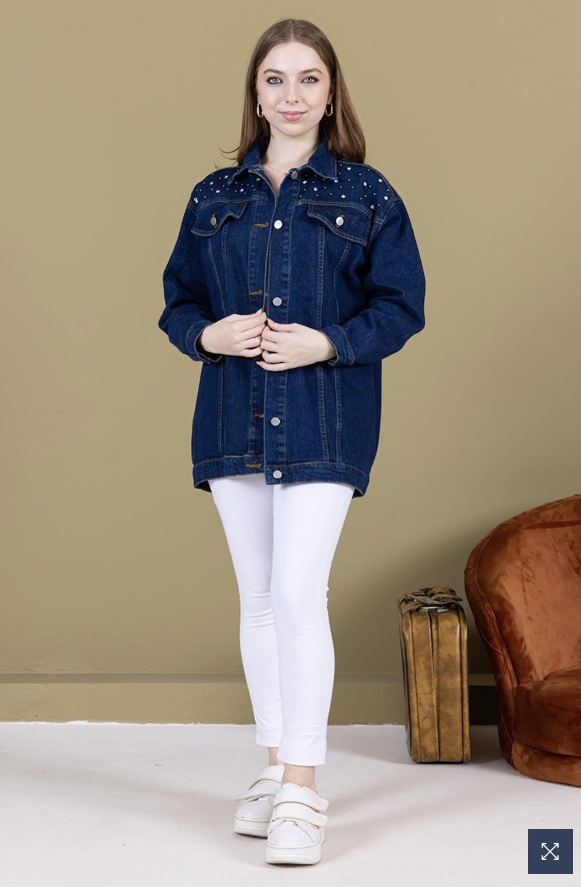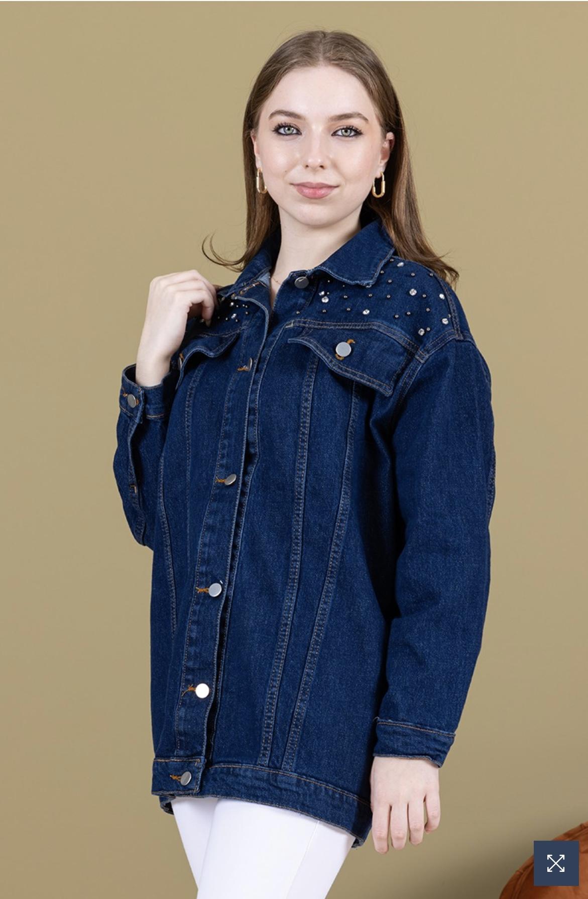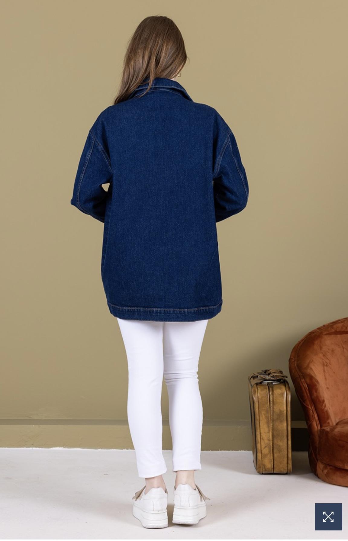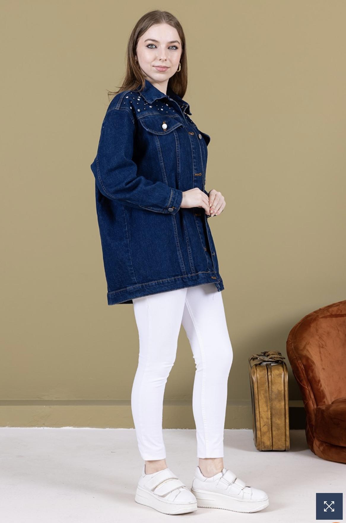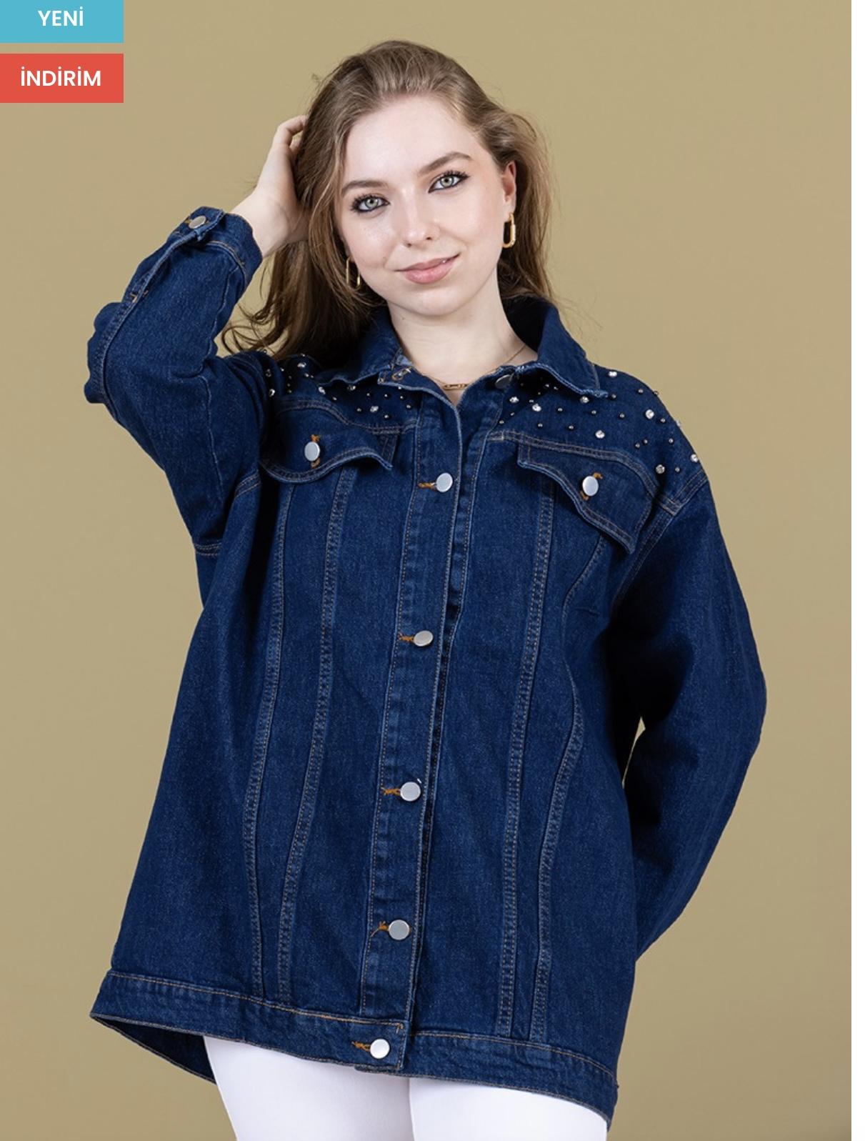 Koyu Mavi Omuz Taş Detay Kot Ceket