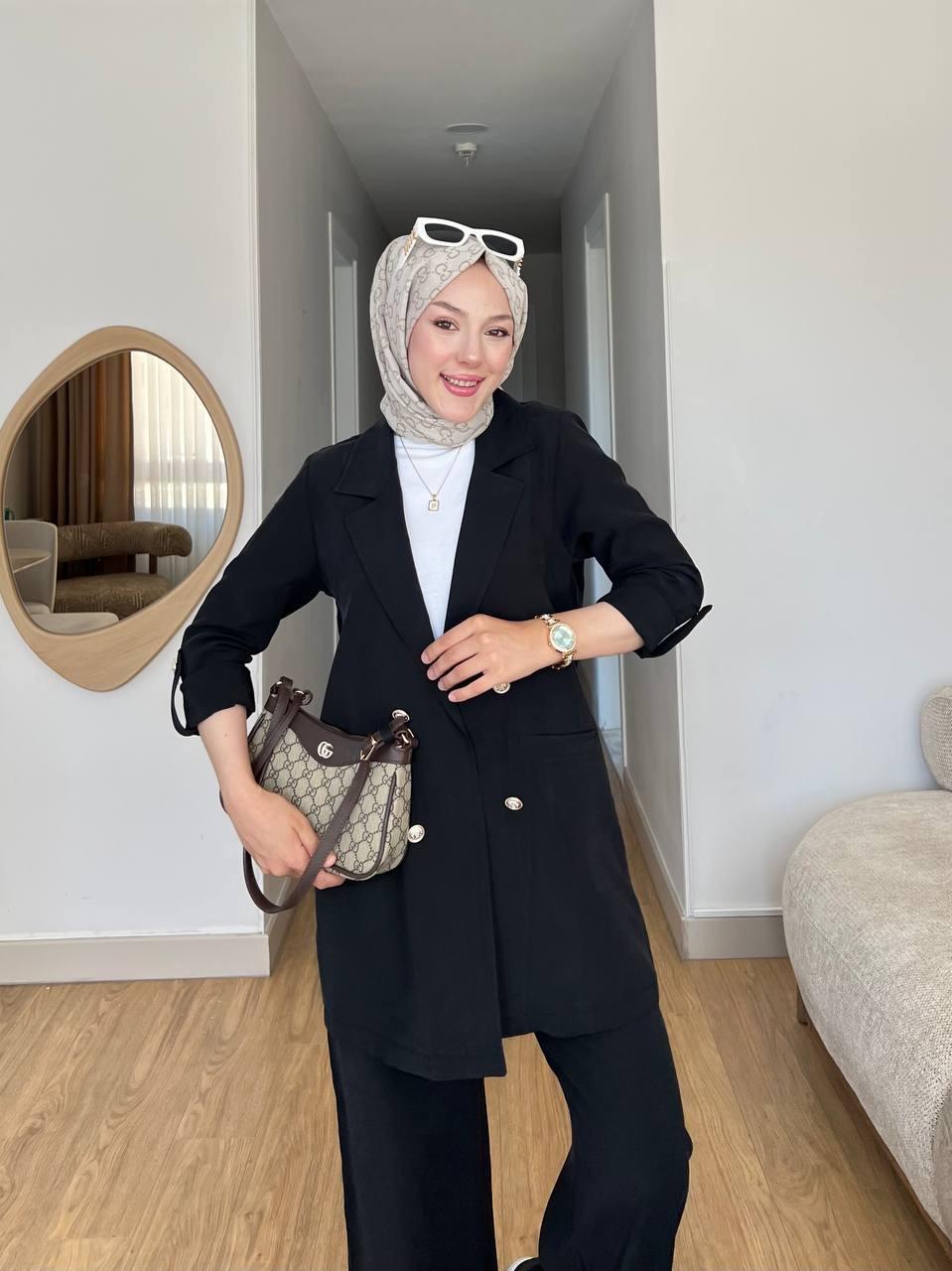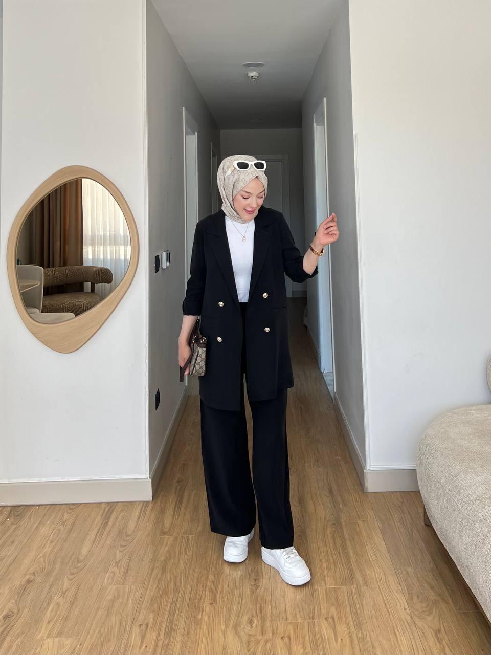 - Rahat kesimi ile günlük kullanım için ideal, oversize kalıpta tasarlanmıştır. - Her bedene uygun geniş seçenek sunan 42 bedeniyle herkesin rahatlıkla tercih edebileceği bir yapıya sahiptir. - Zamansız siyah rengi ve düz deseniyle kolayca kombinlenebilir; şıklığı ve sadeliği ön plana çıkarır. - Normal boy uzunluğu sayesinde farklı vücut tiplerine uyum sağlayarak konforlu bir deneyim sunar. - Türkiye'de üretilmiş olup yerel malzemelerle kalite standartlarına uygun olarak hazırlanmıştır. - Web color özelliği ile dijital ortamlarda da göz alıcı bir görünüm sergilerken, gerçek renk tonlarının canlılığını korur. - İki parçadan oluşan set halinde gelmesiyle hem pratiklik hem de stil sahibi bir görünüm kazandırır.