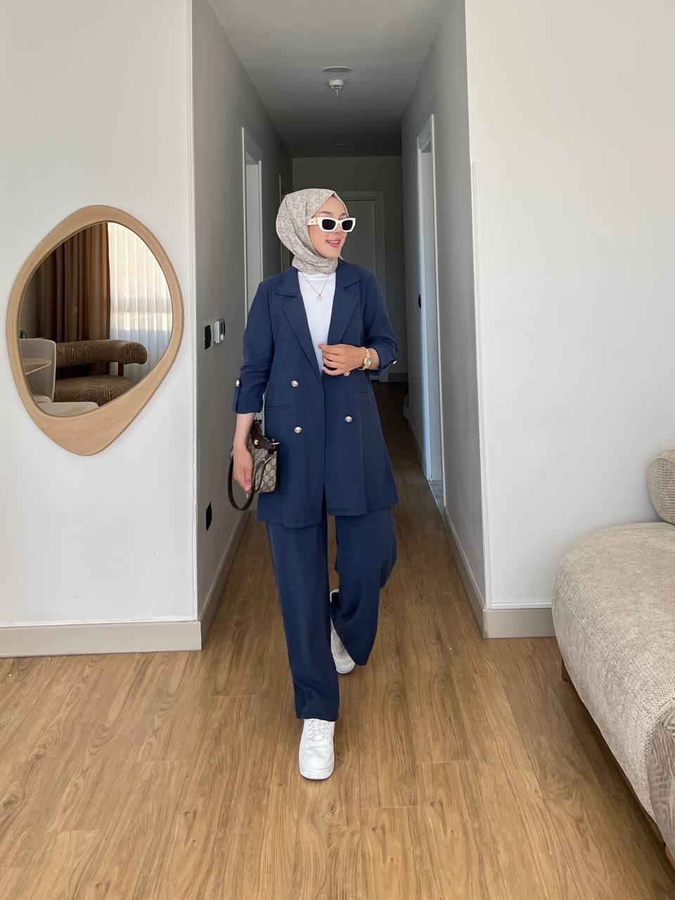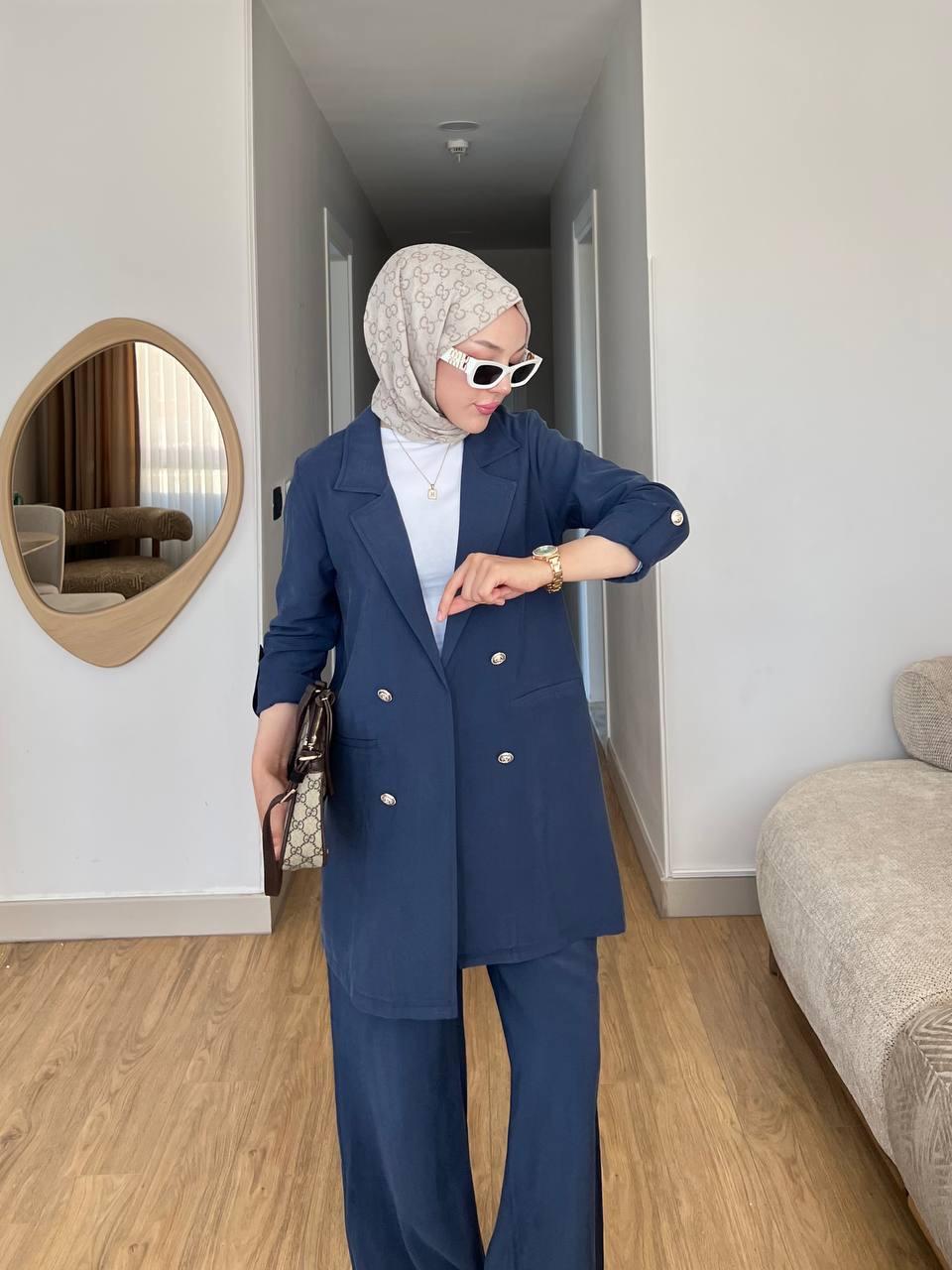 - Rahat kesimi ile günlük kullanım için ideal, oversize ceketli ikili takım. - Yaz aylarında serin tutan hafif dokuma kumaştan üretilmiştir. - Lacivert rengiyle şıklığı ve zarafeti bir arada sunar. - Standart beden seçeneği ile her vücut tipine uyum sağlar. - Normal boy tasarımı sayesinde rahat hareket etme özgürlüğü sağlar. - Türkiye'de üretilmiş olması kalite ve güvenilirlik sunar.