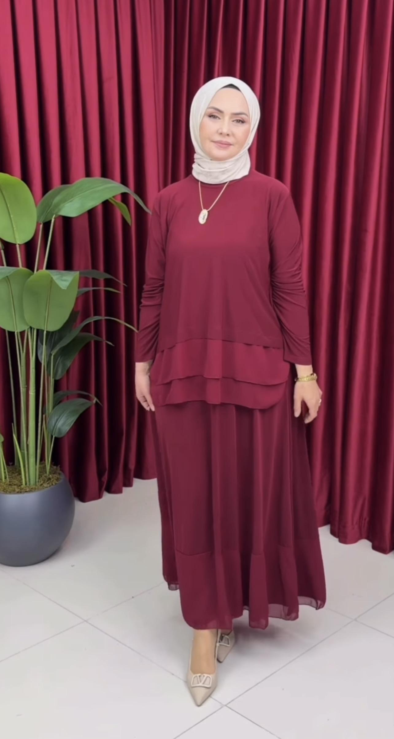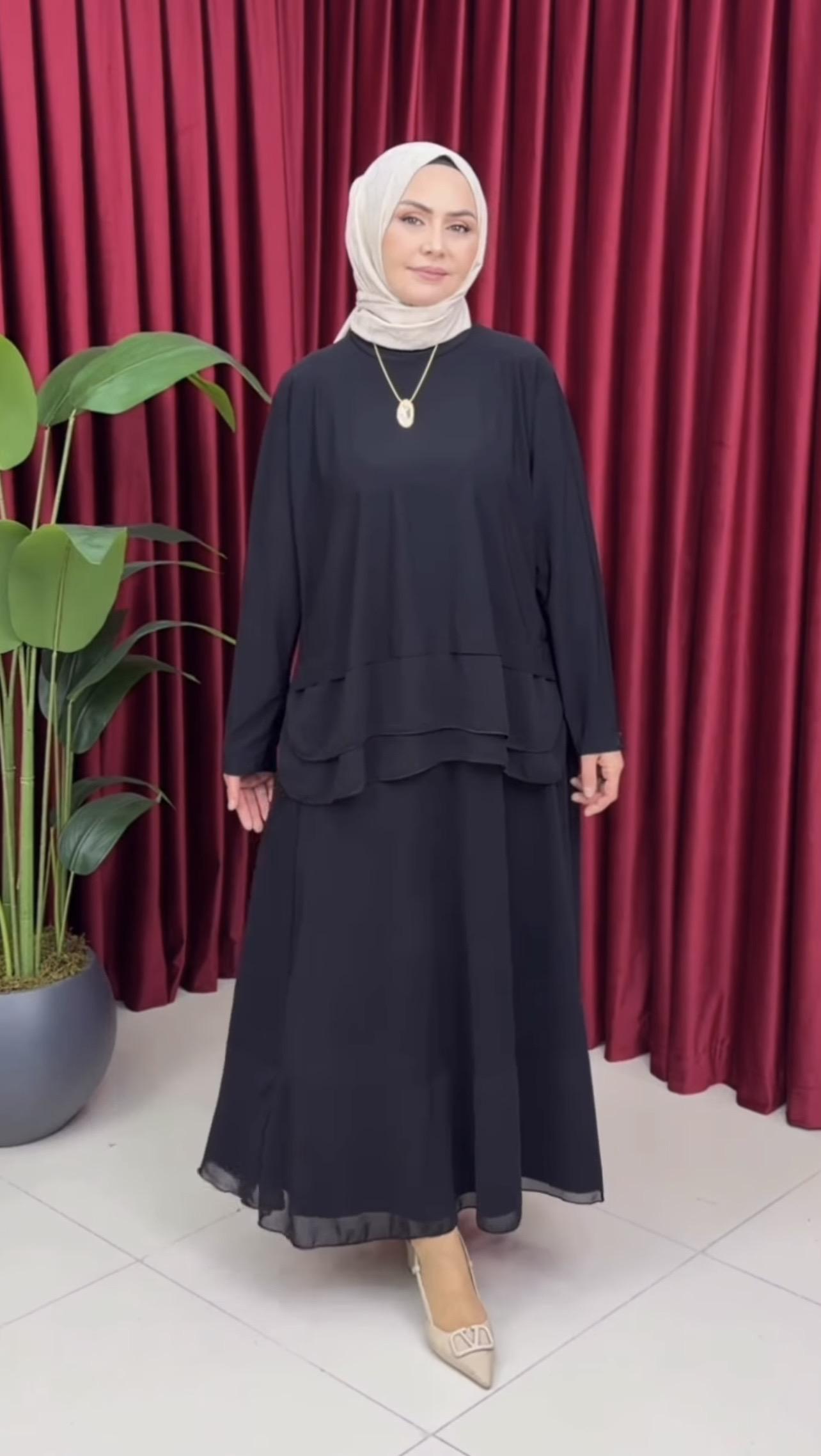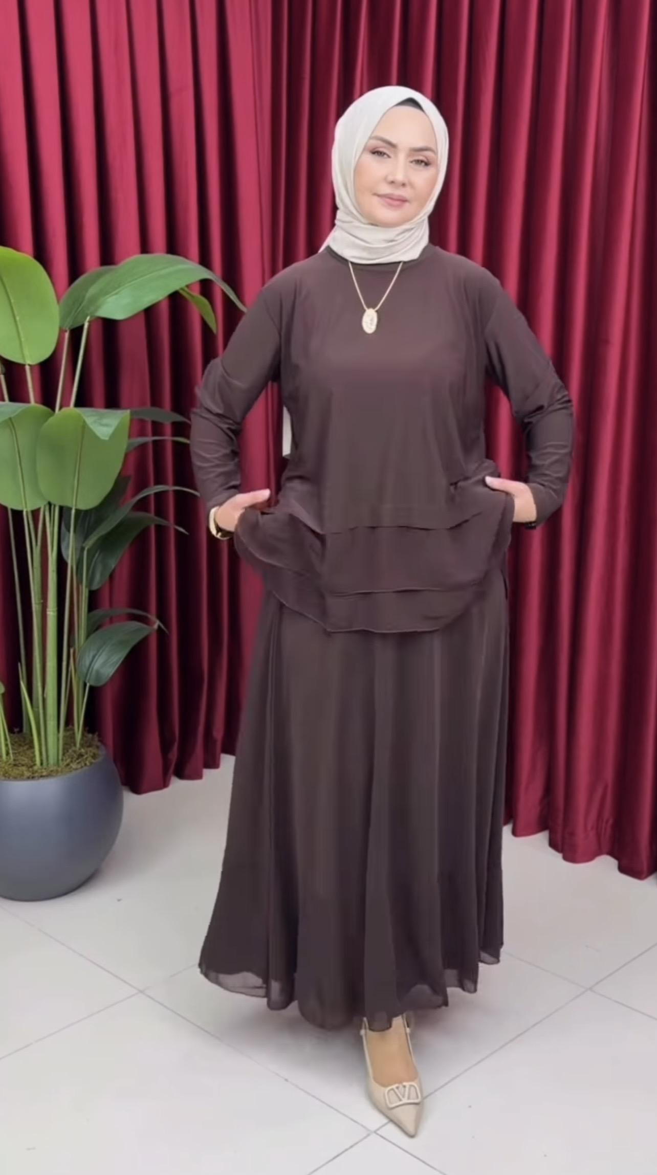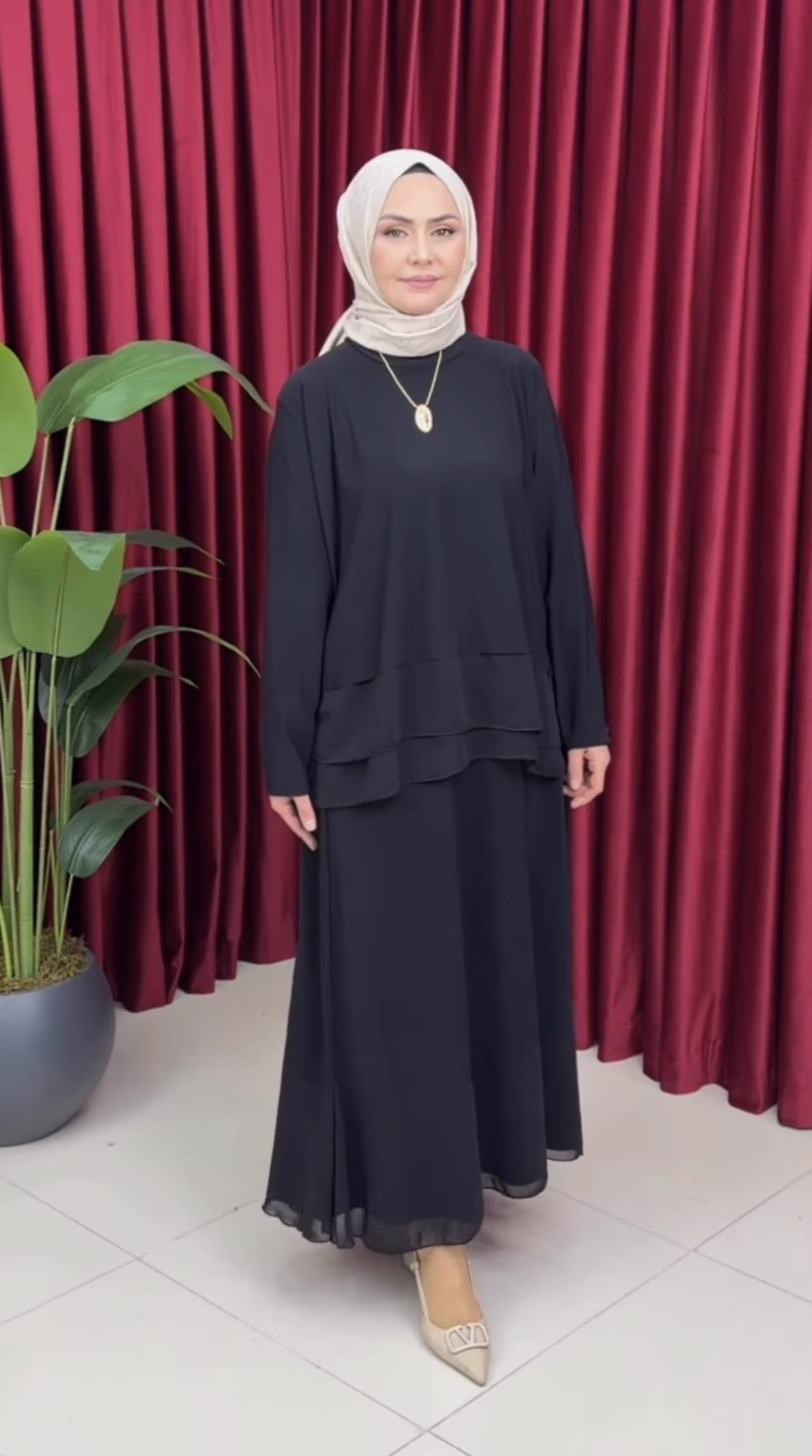 • Tasarım: Bluzun etek ucundaki zarif katlı şifon detayları, takıma hareketli ve modern bir hava katar.