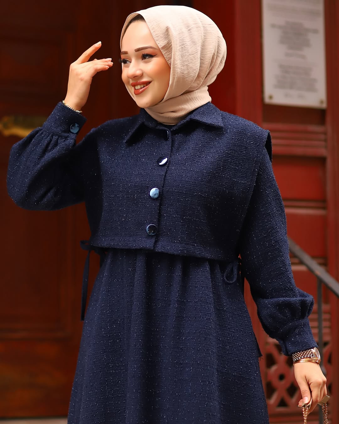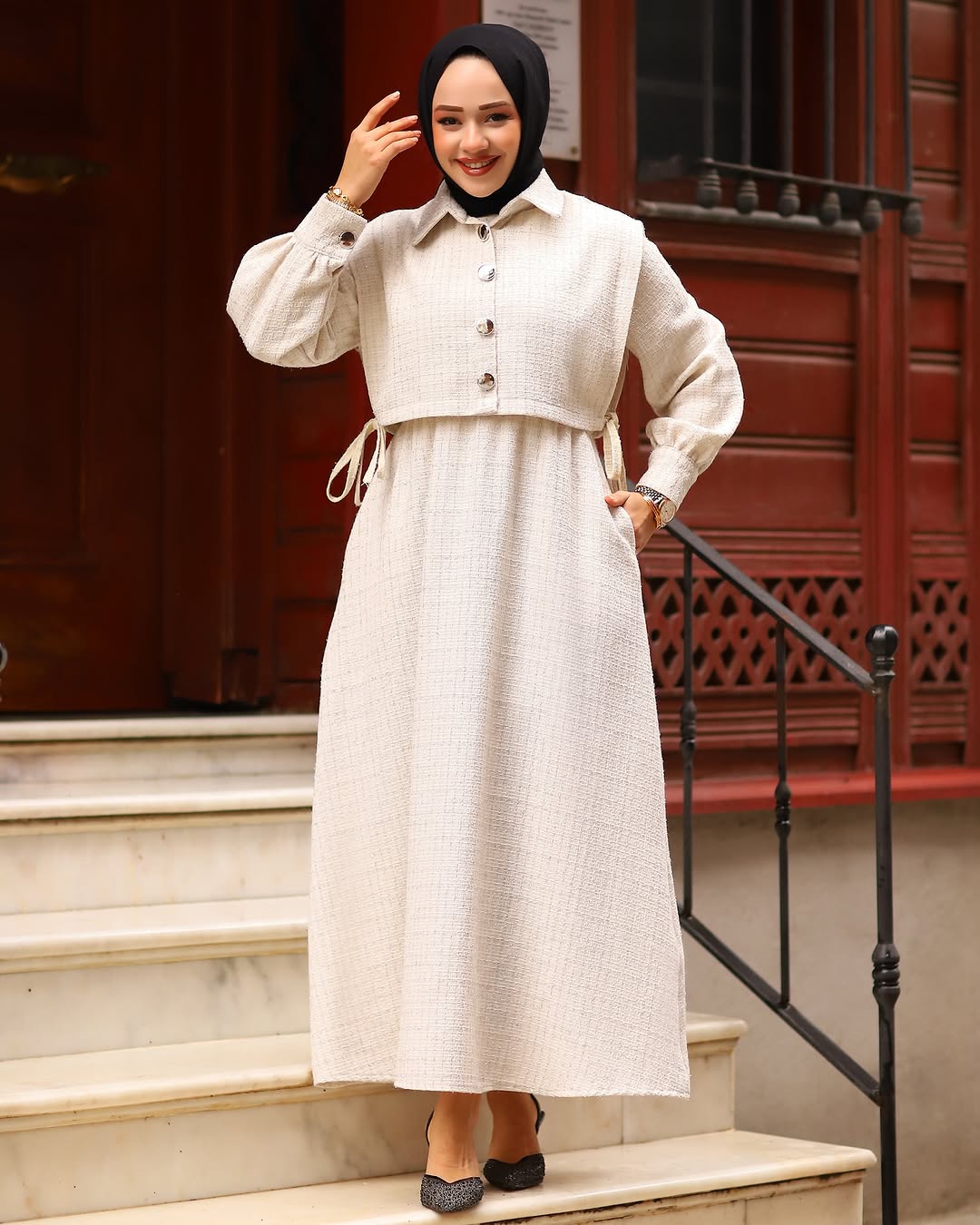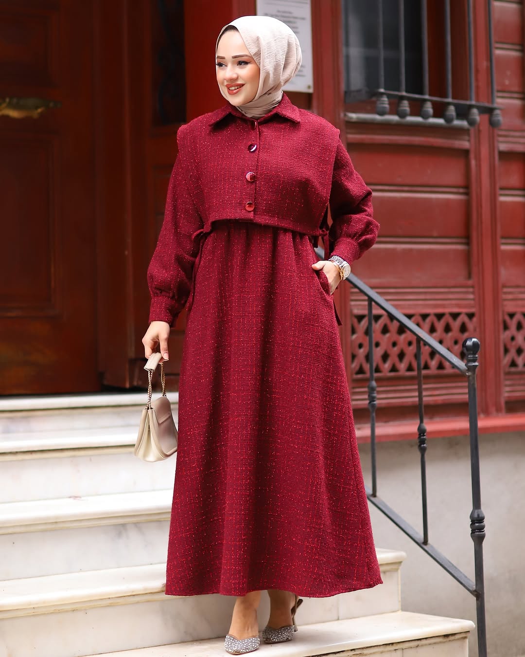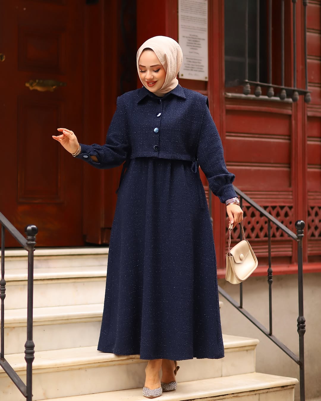 - Detaylar: Cepkenin düğme detayları ve bel kısmındaki ince dikişler, elbiseye ayrı bir zarafet katar.