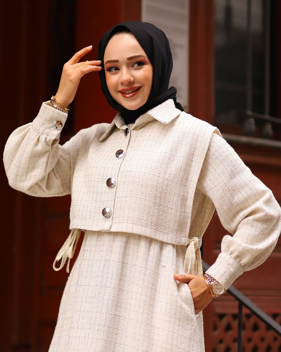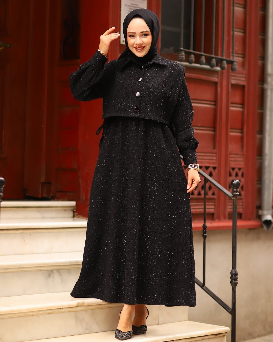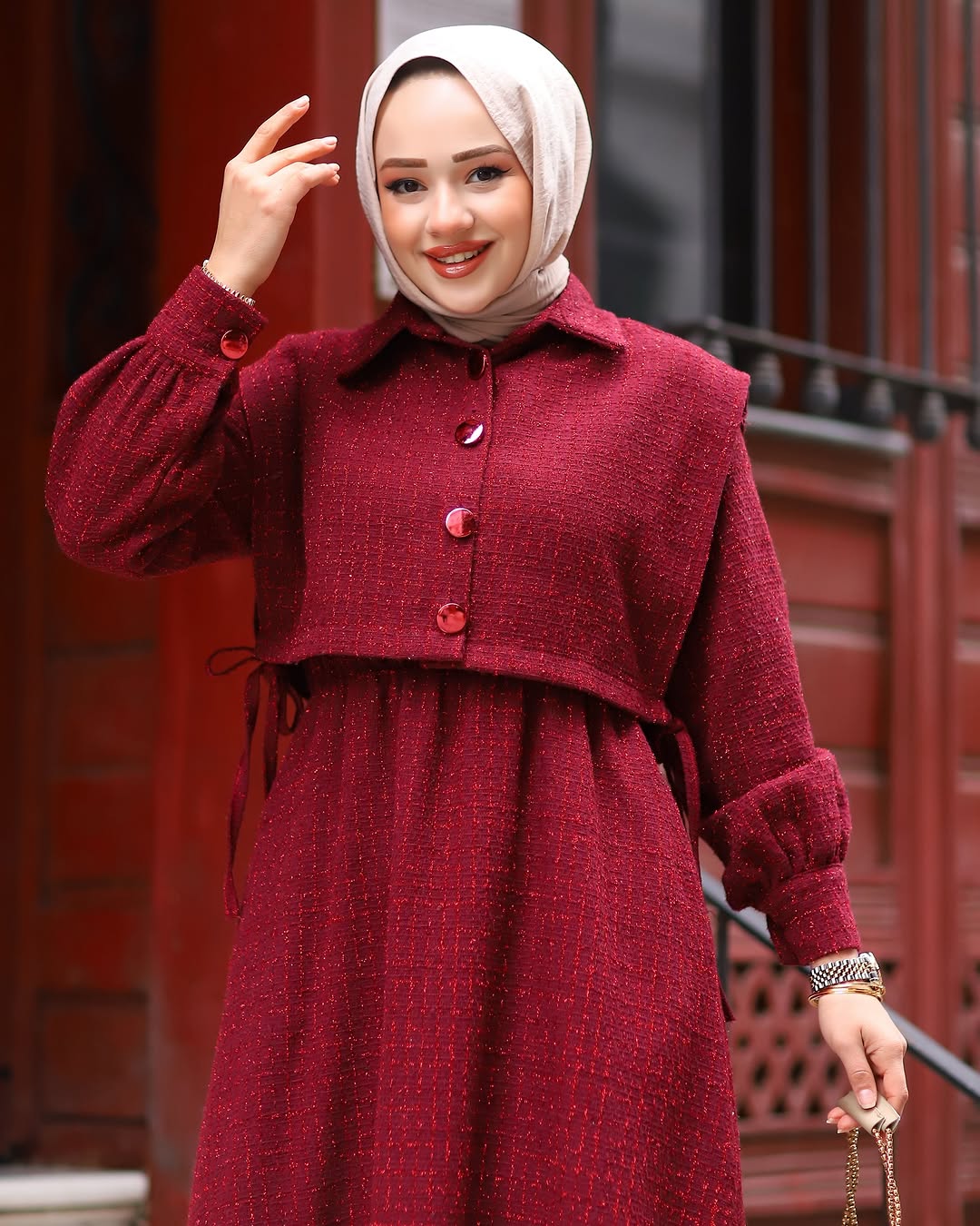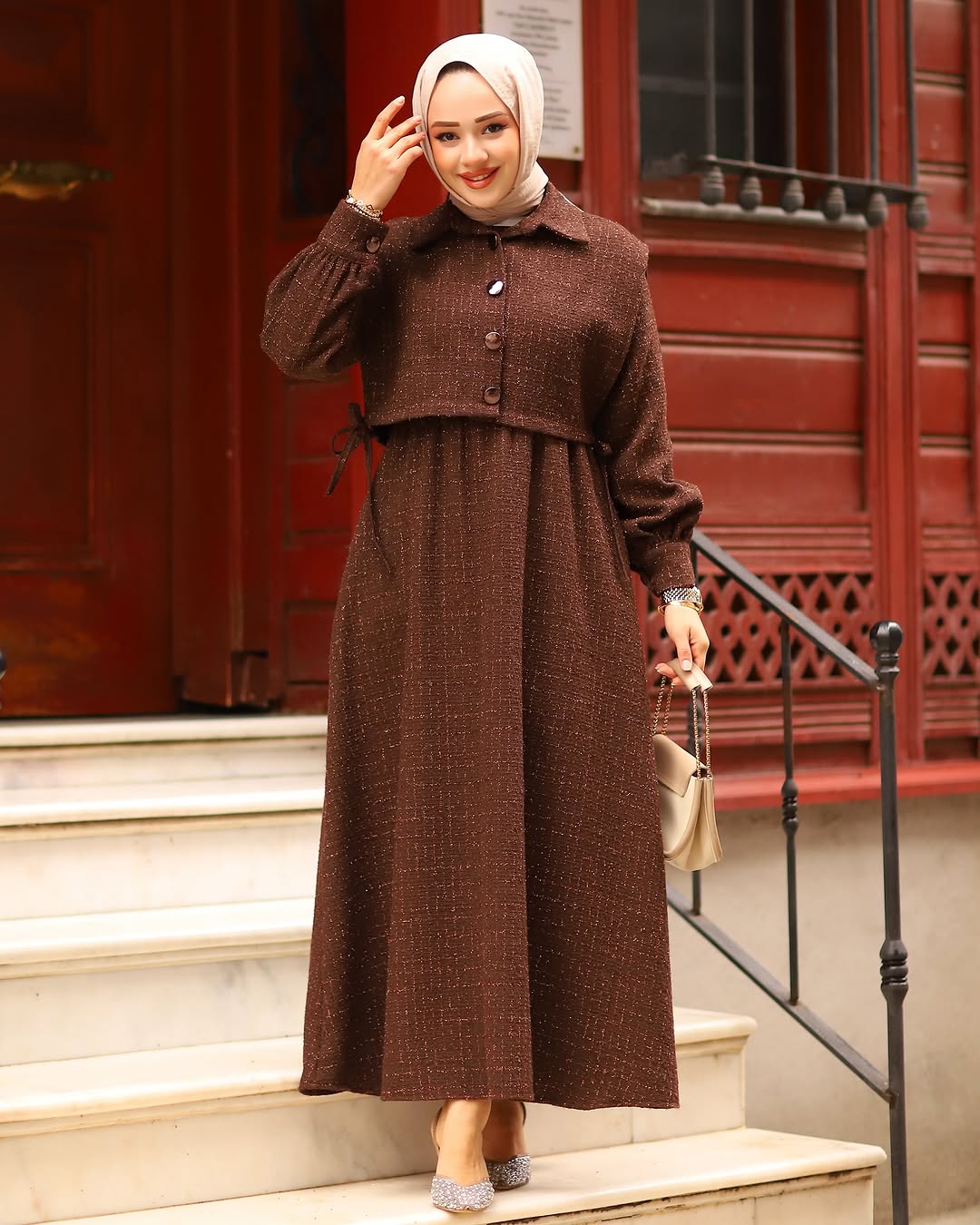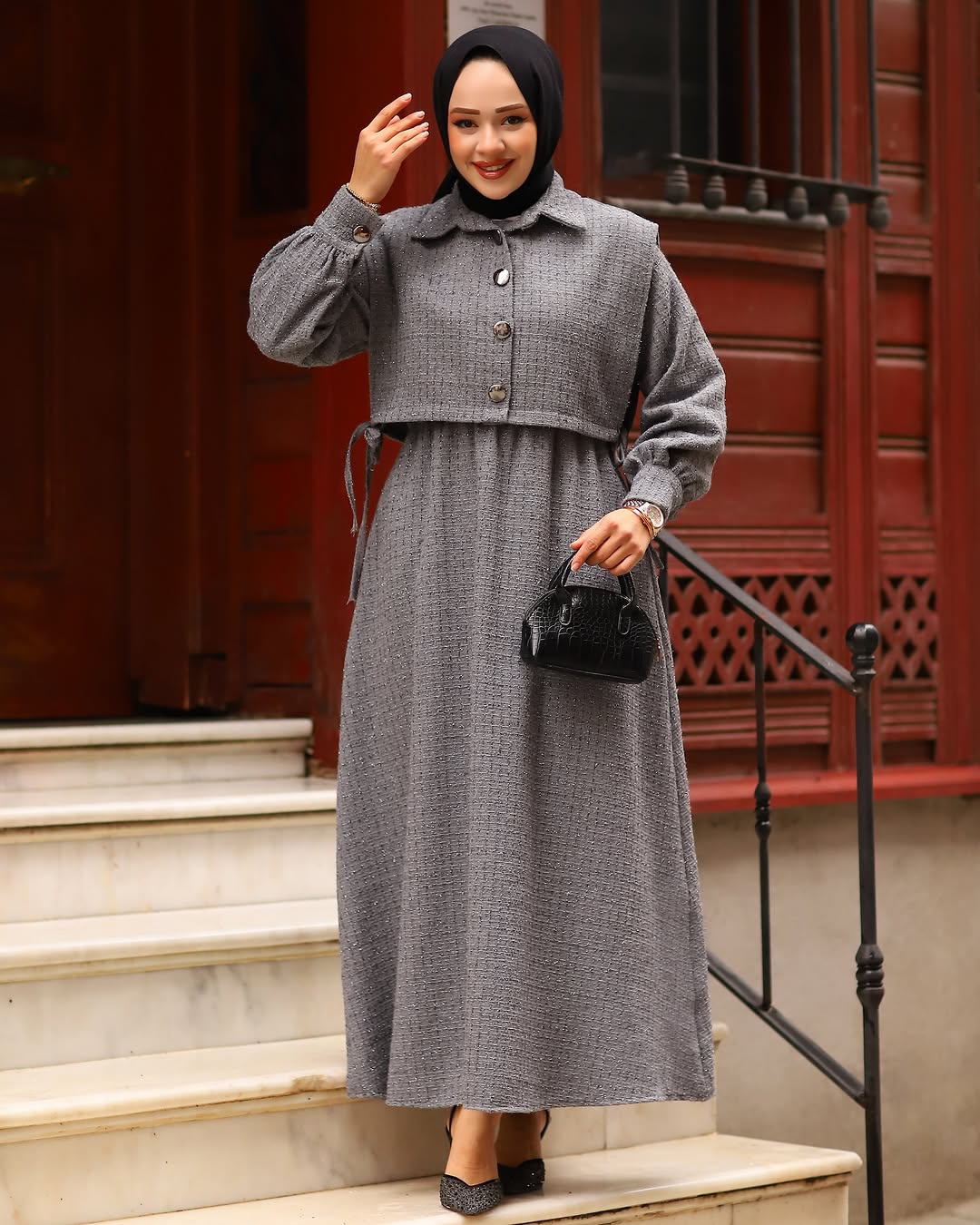 - Detaylar: Cepkenin düğme detayları ve bel kısmındaki ince dikişler, elbiseye ayrı bir zarafet katar.